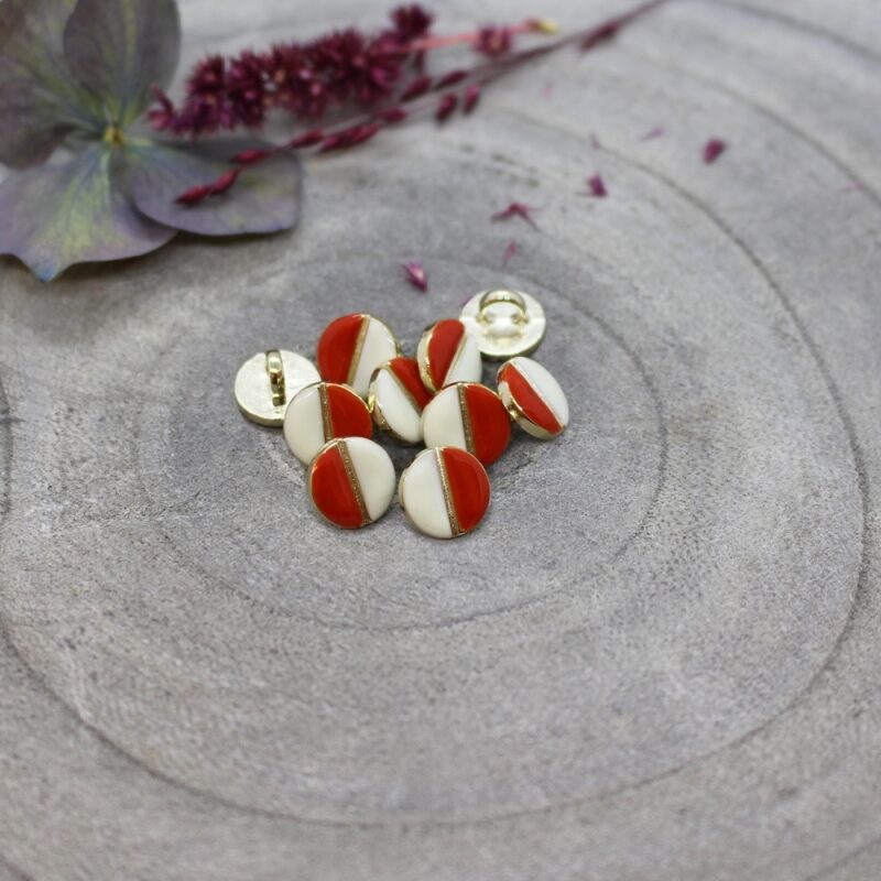 Der kleine, edle Knopf von Atelier Brunette  ist trés chic! Der kleine, runde „Wink Off-White“-Knopf hat eine zweifarbige Emaille-Oberfläche, die durch eine dünne goldene Zamak-Linie getrennt ist. Eine Hälfte ist Cremeweiß, die andere Hälfte ist farblich gestaltet und harmoniert mit den Stoffkollktionen von Atelier Brunette  perfekt. Diese Knöpfe verleihen auch den einfachsten Kreationen einen Hauch von Eleganz.