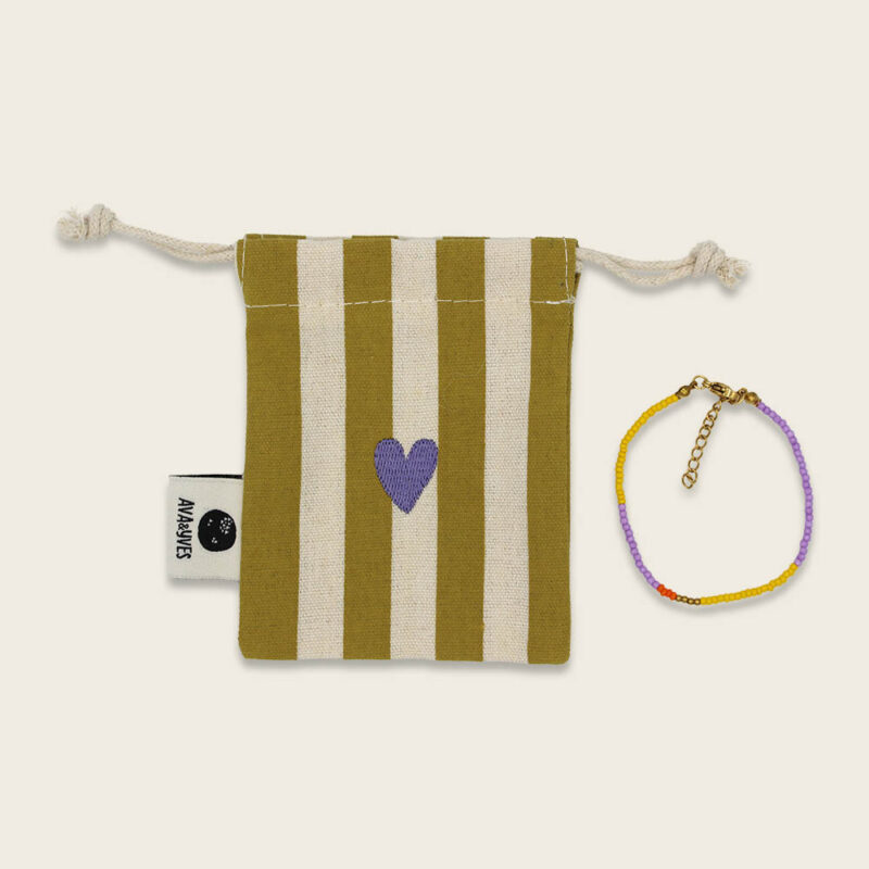 Das Armband „ColorBlock“ in Lila-Gelb mit Karabiner-Verschluß kommt im kleinem Säckchen in Ocker/Weiß – perfekt zum Verschenken!