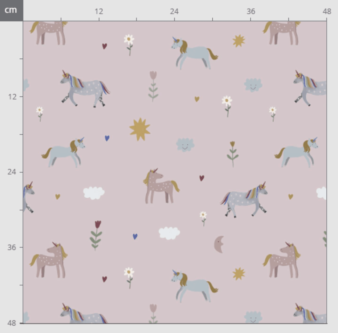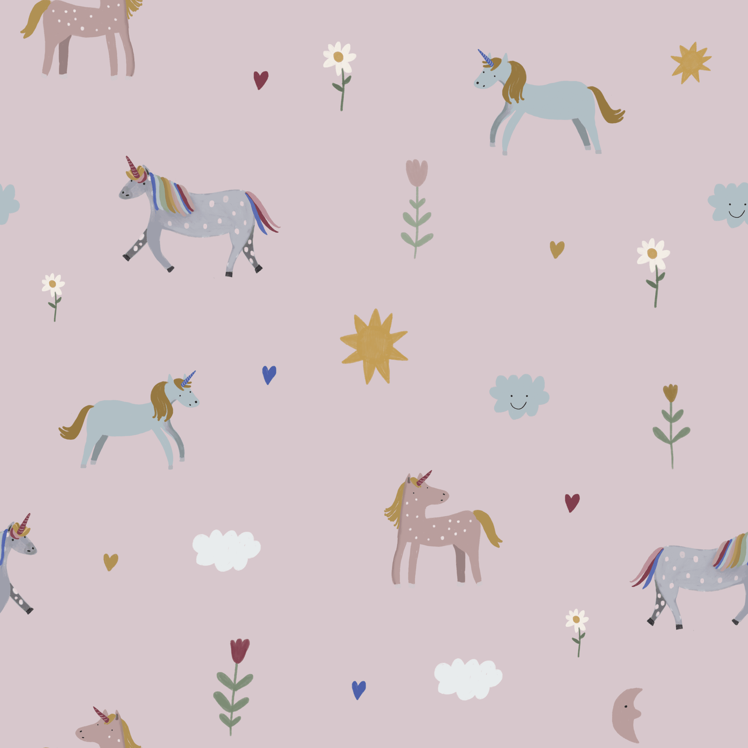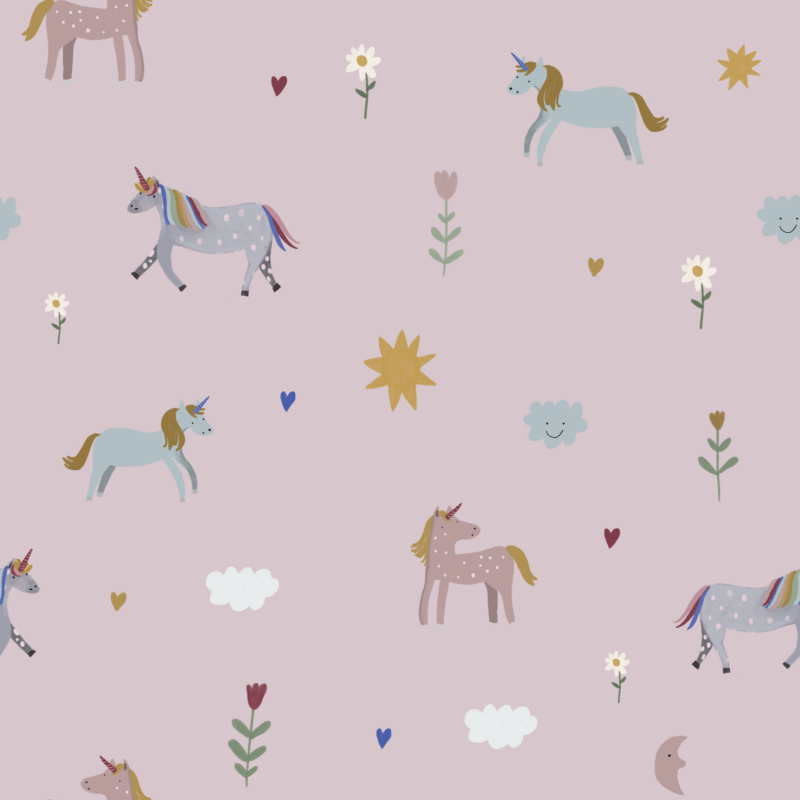 Bei soviel Einhornpower schlagen hier sicher so manche Herzen höher. Sarah vom Label Gretas Shwester  hat diese fröhliche Wiese voller zauberhafter Vierbeiner illustriert – mit kleinen Blümchen und Herzen lieblich aufgefrischt