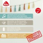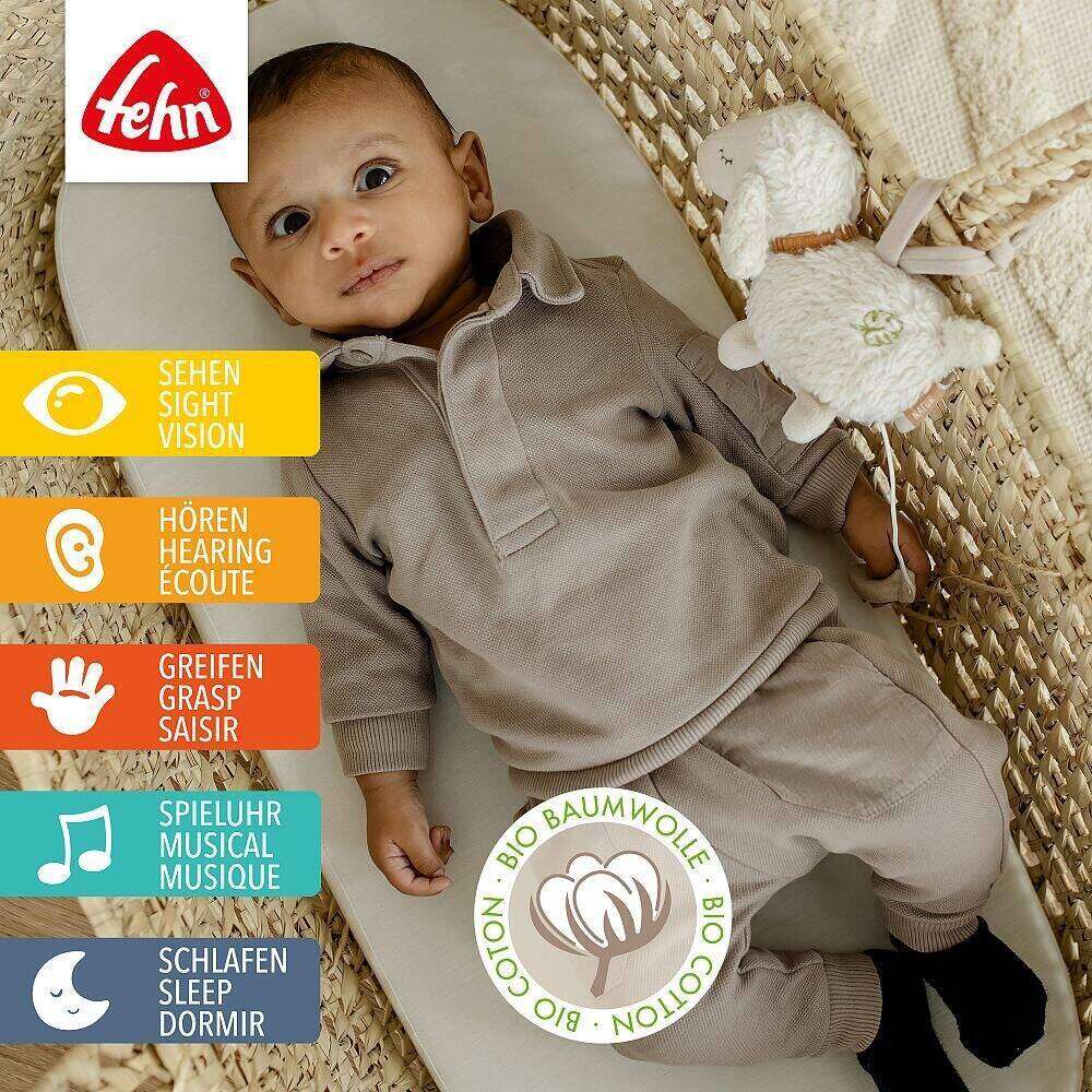 Mit Befestigungsbändchen kannst du die Spieluhr überall– im Bett, Kinderwagen oder Autositz– sicher anbringen. Das herausnehmbare Spielwerk spielt ca. 1,5–2 Minuten und ist leicht zu reinigen – einfach im Schonwaschgang bei 30°C!