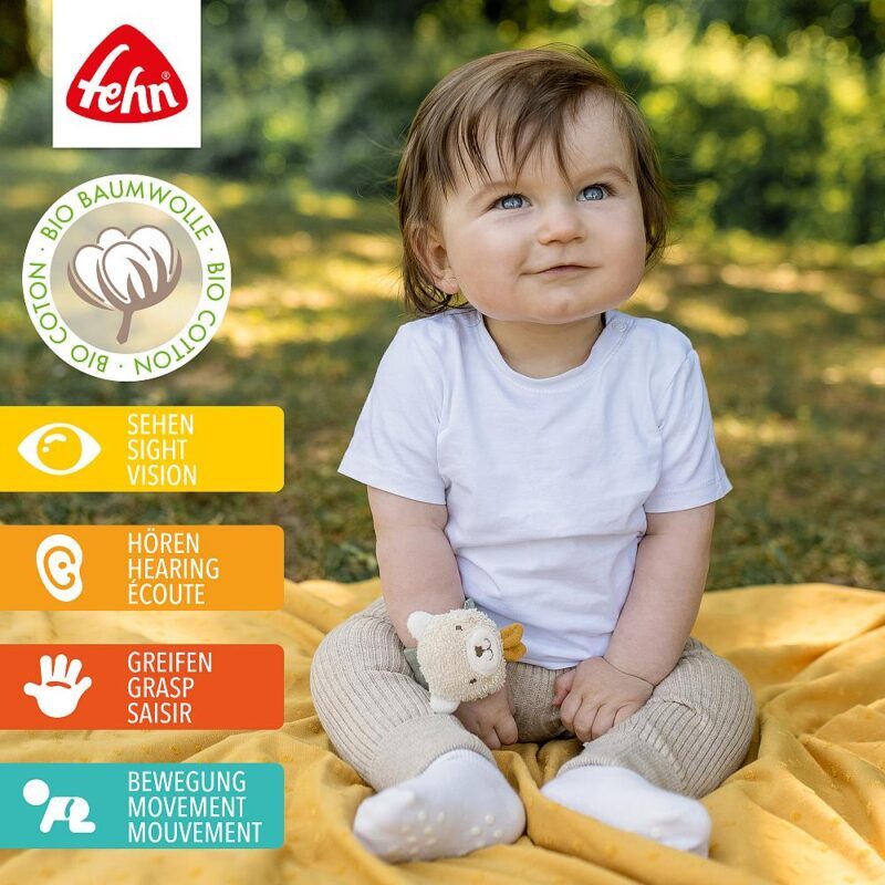 Unser Activity-Armband mit Rassel aus biologischer Baumwolle ist der perfekte Begleiter für dein Baby ab 0+ Monaten. Das kuschelige Schaf lässt sich einfach anlegen, fördert die Neugier und regt zum Schütteln, Greifen und Fühlen an. Mit weichem Jersey, Frottee, Nicki und Musselin begeistert es kleine Entdecker und unterstützt die Entwicklung von Hör-, Tast- und Greifgefühl sowie die Feinmotorik. Ob zuhause, unterwegs oder im Kinderwagen – das handliche Armband bleibt immer griffbereit und ist ein tolles Geschenk zur Geburt, Taufe oder zum Geburtstag.