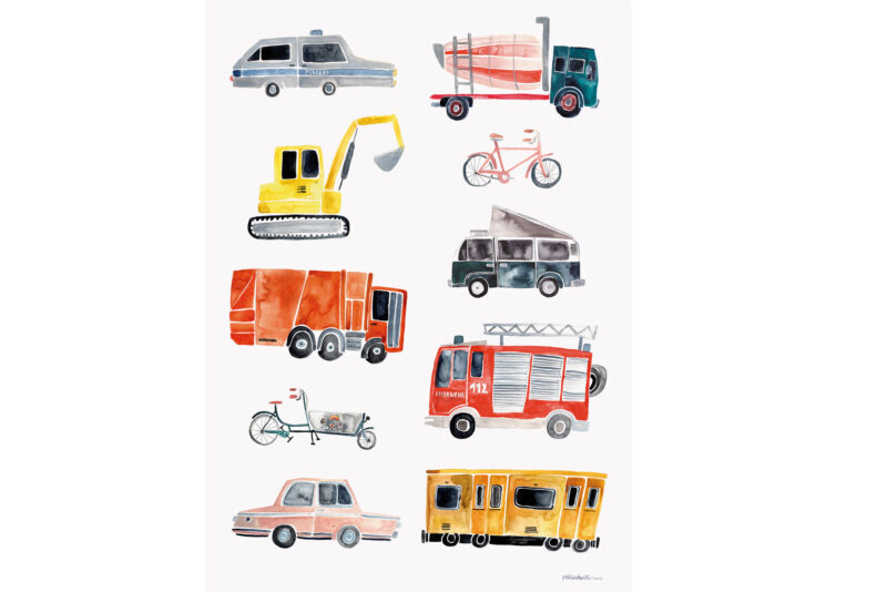 Dieses liebevoll illustrierte von Gretas Schwester bringt viele verschiedene Fahrzeuge wunderschön und bunt an die Wand. Das Plakat in DIN A2 ist auf hochwertigem, matten 170g Recyclingpapier gedruckt.