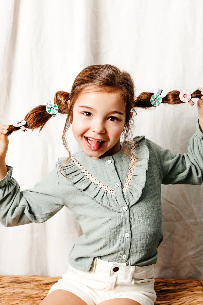 Hier ist ein Paar Haarspangen, die gut nach Urlaub schreien; ideal – für einen schönen sonnigen Tag am Strand! Die Haarspangen von Luciole et Petit Pois kommen mit Neon-Detail – ein cooler Sommer-Look kinderleicht gezaubert.