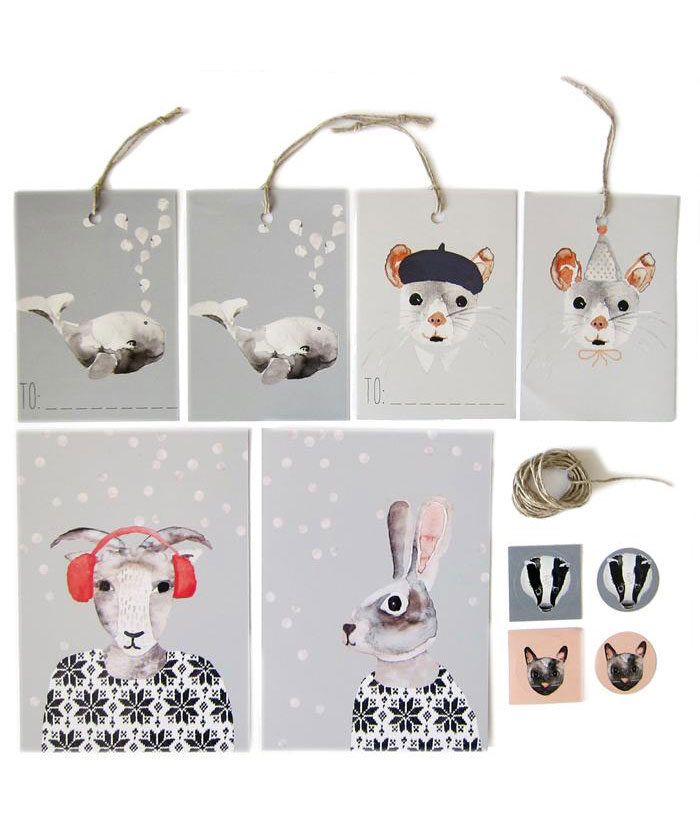 2 Postkarten (Schaf + Hase), 10 runde Sticker (2 cm, mit Dachs + Katze), 10 Anhänger (7×5 cm, mit Maus + Wal) und naturfarbene Kordel für die Anhänger.