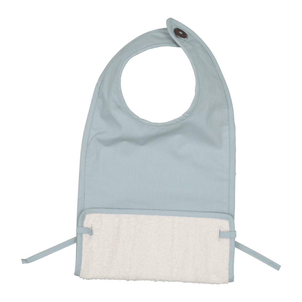 Am Hals hinten wird es zu geknöpft und ist dadurch in zwei Größen verstellbar. Vorne ist der Stoff aus GOTS-zertifizierter Baumwolle wasserabweisend beschichtet und hinten aus wunderbar weichem Frottee.