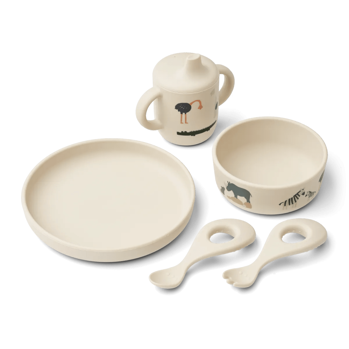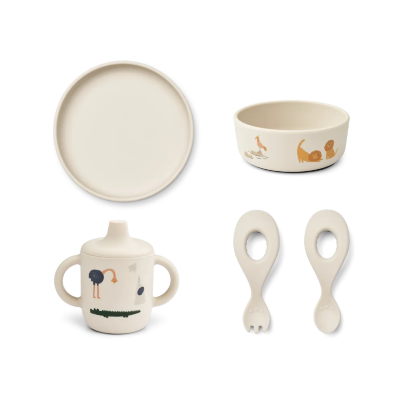 Das Geschirr-Set enthält die Göffel ‚Liva‘, die Tasse ‚Neil‘, die Schale ‚Iggy‘ und den Teller ‚Olivia‘ – alle mit einzigartigen Motiv und aus weichem, sicherem Silikon. Geräuschlos und spülmaschinengeeignet.