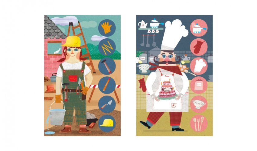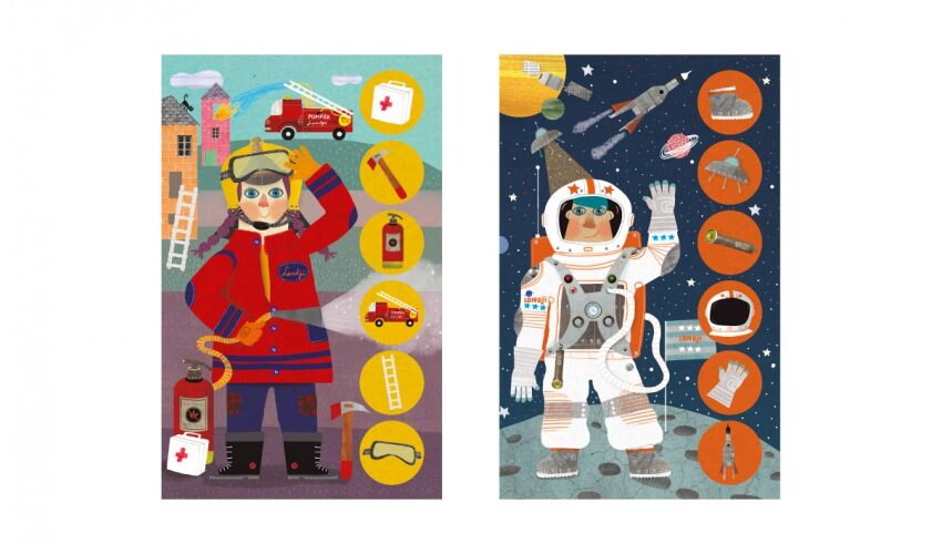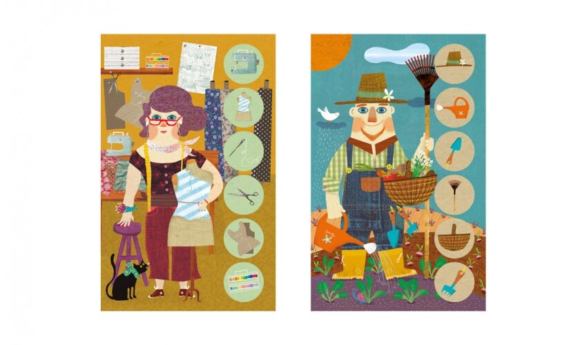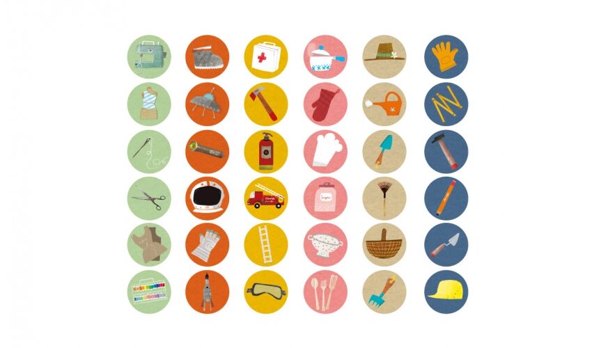 6 Sammelskarten und 36 runde Karten mit Werkzeugen des jeweiligen Berufes in einem schönen Aufbewahrungs Karton.