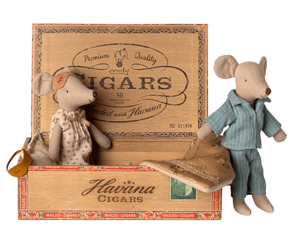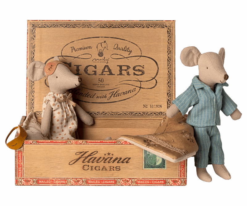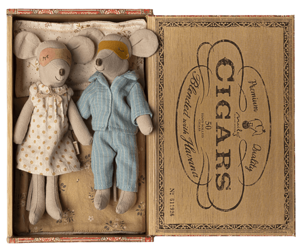 Ein klassischer Maileg-Artikel. Mama und Papa Mäuse tragen ihre schöne Nachtwäsche und Augenmasken. Die Zigarrenkiste ist ein perfektes Bett für einen erholsamen Schlaf und süße Träume.