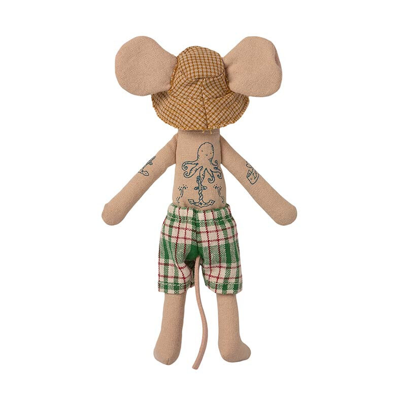 Ich will Meer! Der coole Maileg-Mäusepapa ist bereit für einen entspannten Tag am Strand. Mit allem, was dazugehört – einem Sonnenhut und karierter Badehose. Mehr braucht es nicht um sich in die Wellen zu stürzen. In der schönen Strandumkleidekabine wird schnell in die Badeshorts geschlüpft, Sonnenhut abgelegt und schon geht’s in die Fluten.