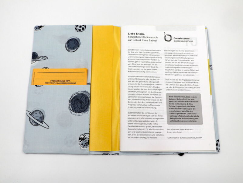 Mit dieser Mutterpasshülle bleibt der Mutterpass immer gut geschützt und ist dazu noch ein hübscher Begleiter für unterwegs. Es ist genügend Platz für Überweisungen, Ultraschallbilder und andere wichtige Unterlagen. Für 5 EUR kann der Name mit Holzwürfeln auf das Verschlussband gezogen werden.