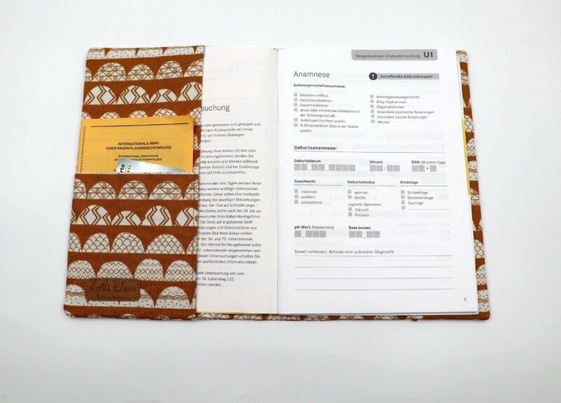 Mit dieser U-Heft Hülle bleibt das U-Heft immer gut geschützt und ist dazu noch ein hübscher Begleiter für unterwegs. Für 5 EUR kann ein Name mit Holzwürfeln auf das Verschlussband gezogen werden.