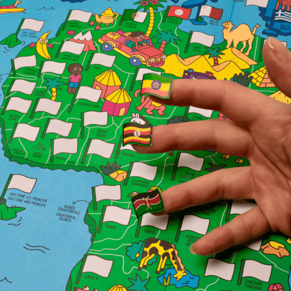 Mithilfe der Sticker entdecken Sie durch aufeinanderfolgende Beobachtungen und Assoziationen, wie Sie die Länder besser erkennen und auf der Weltkarte platzieren können.