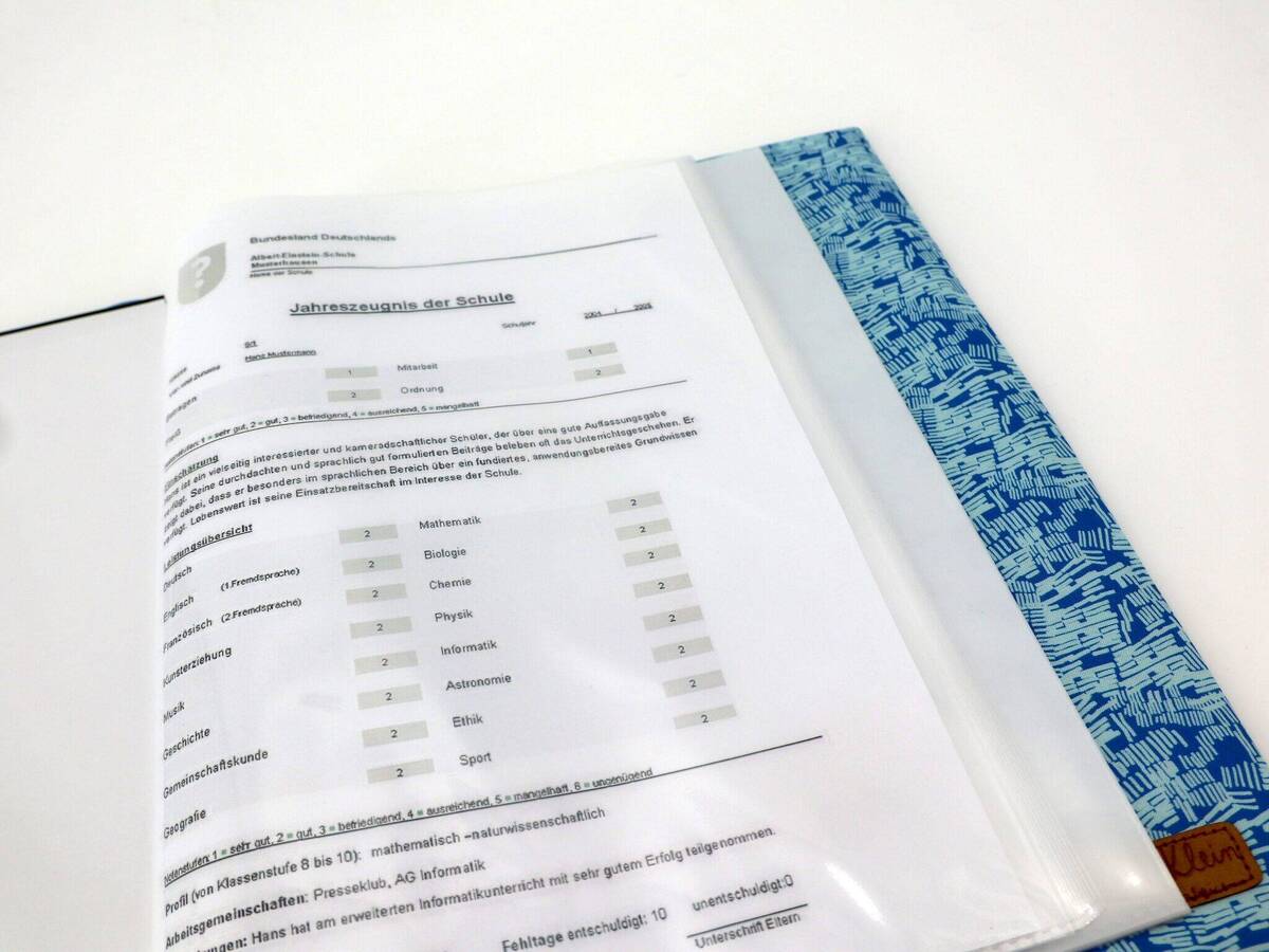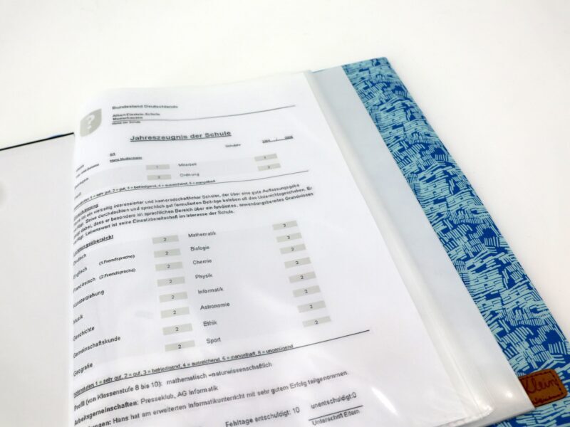 Unsere Zeugnismappen kommen mit einem Sichtbuch im A4-Format. Das Sichtbuch enthält 30 Folien. So sind Zeugnisse, Urkunden, Notenblätter oder die gesammelten Kunstwerke Deines Kindes bestens aufgehoben und können dank des einzigartigen Einbandes noch ein wenig stolzer präsentiert werden!