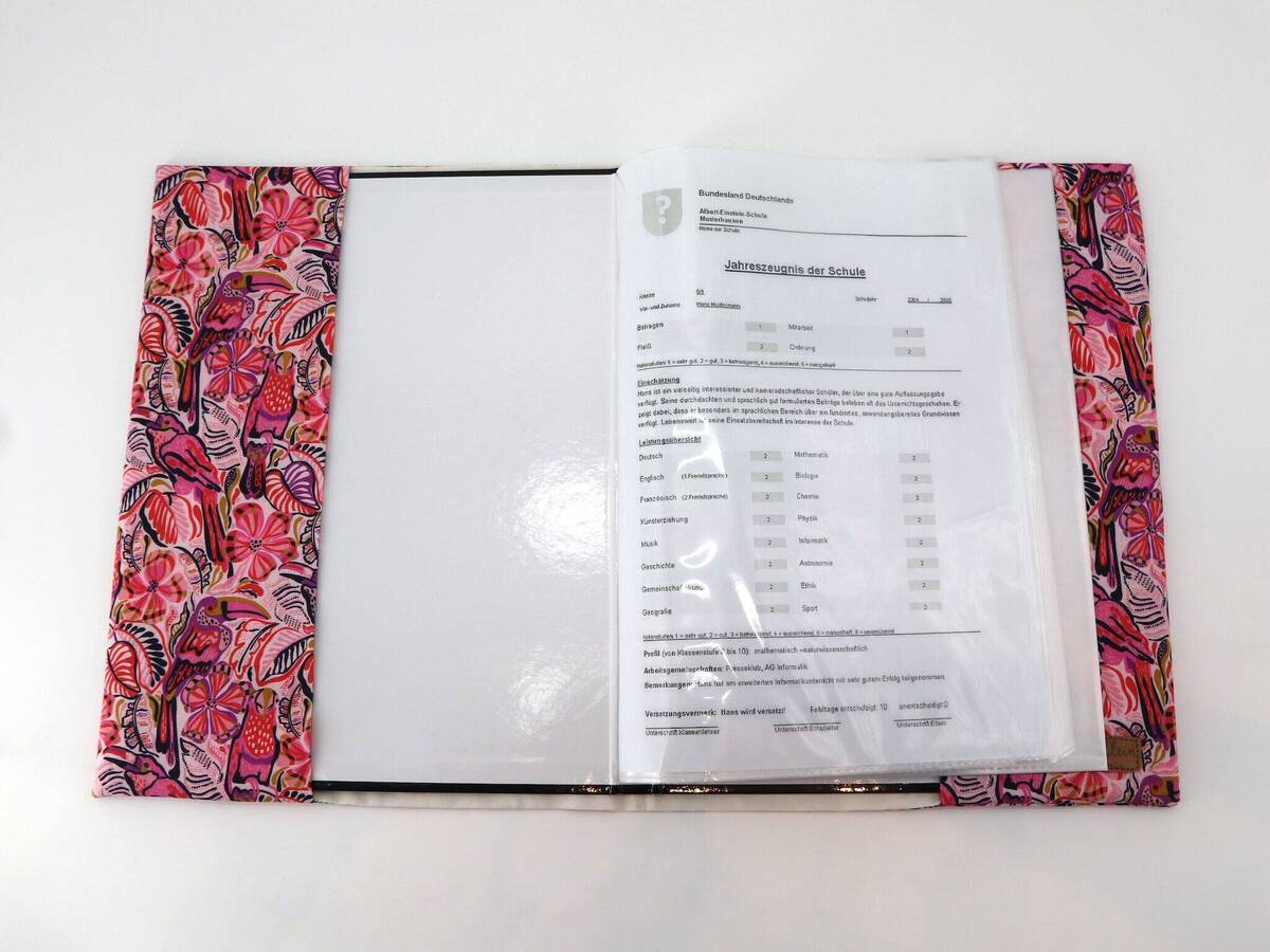 Unsere Zeugnismappen kommen mit einem Sichtbuch im A4-Format. Das Sichtbuch enthält 30 Folien. So sind Zeugnisse, Urkunden, Notenblätter oder die gesammelten Kunstwerke Deines Kindes bestens aufgehoben und können dank des einzigartigen Einbandes noch ein wenig stolzer präsentiert werden!