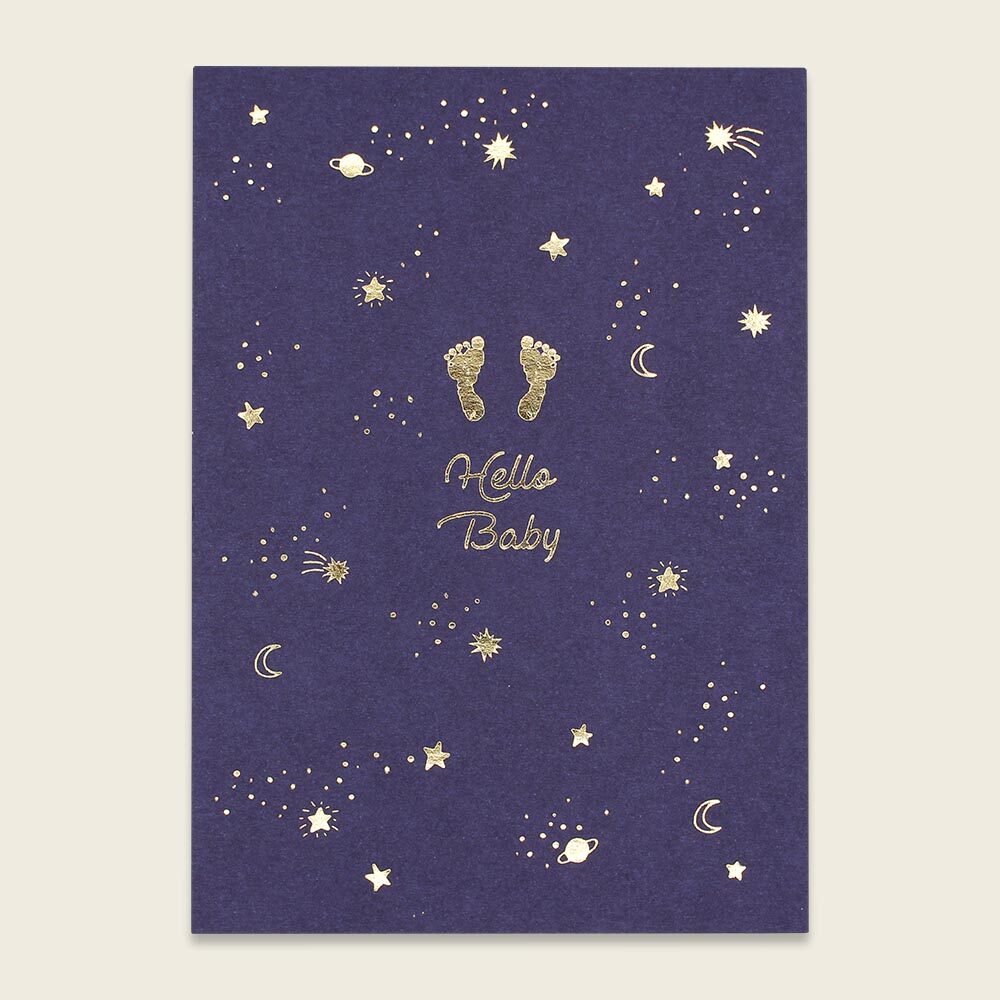 Postkarte Sterne und Planeten, nachtblau mit Goldfolie – Hello Baby
