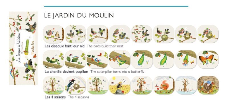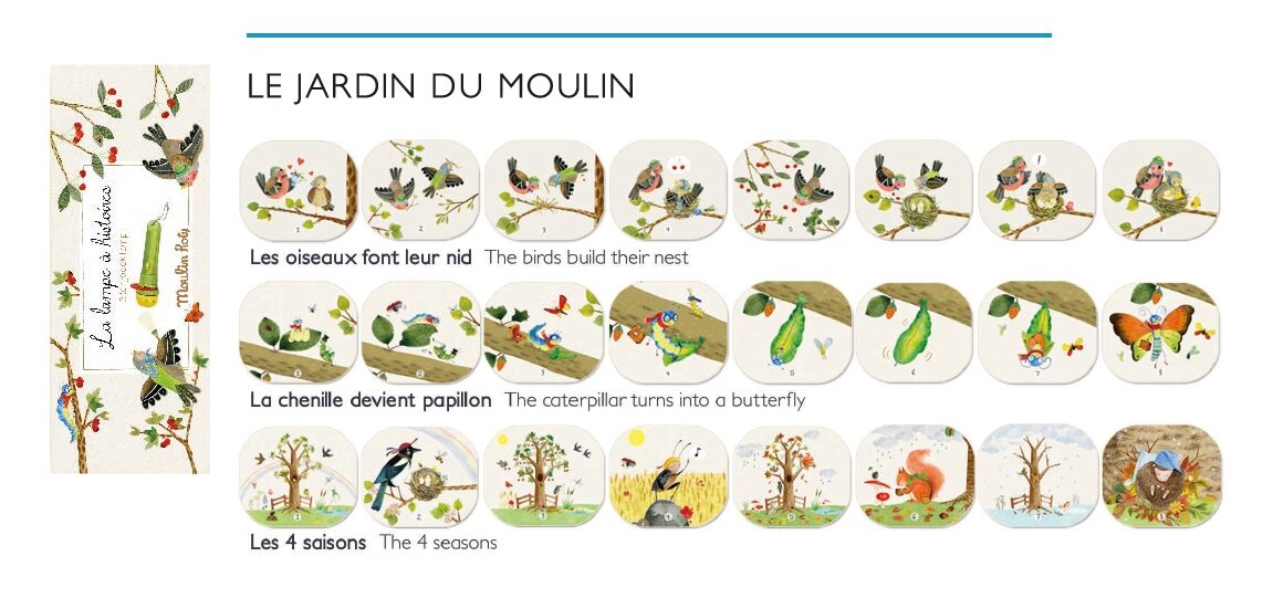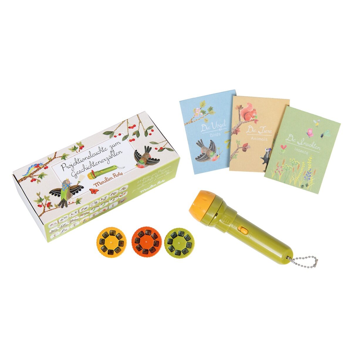 Die Projektionsleuchte von Moulin Roty bietet eine originelle Art, Geschichten zu erzählen! Verschiedene Scheiben projizieren liebevoll illustrierte Bilder an die Wand. Im Lieferumfang sind neben der Taschenlampe 3 verschiedene Bildreihen enthalten – „Vögel machen ihre Nester“, „Die Raupe wird zum Schmetterling“ und „Die vier Jahreszeiten“. Die Handhabung ist kinderleicht – die Bilder-Disc einsetzen, einschalten und mit dem Daumen zu nächsten Szene weiterdrehen. Zu den Themen begleitend, werden drei Minibücher mitgeliefert. Licht aus, Fantasie an!