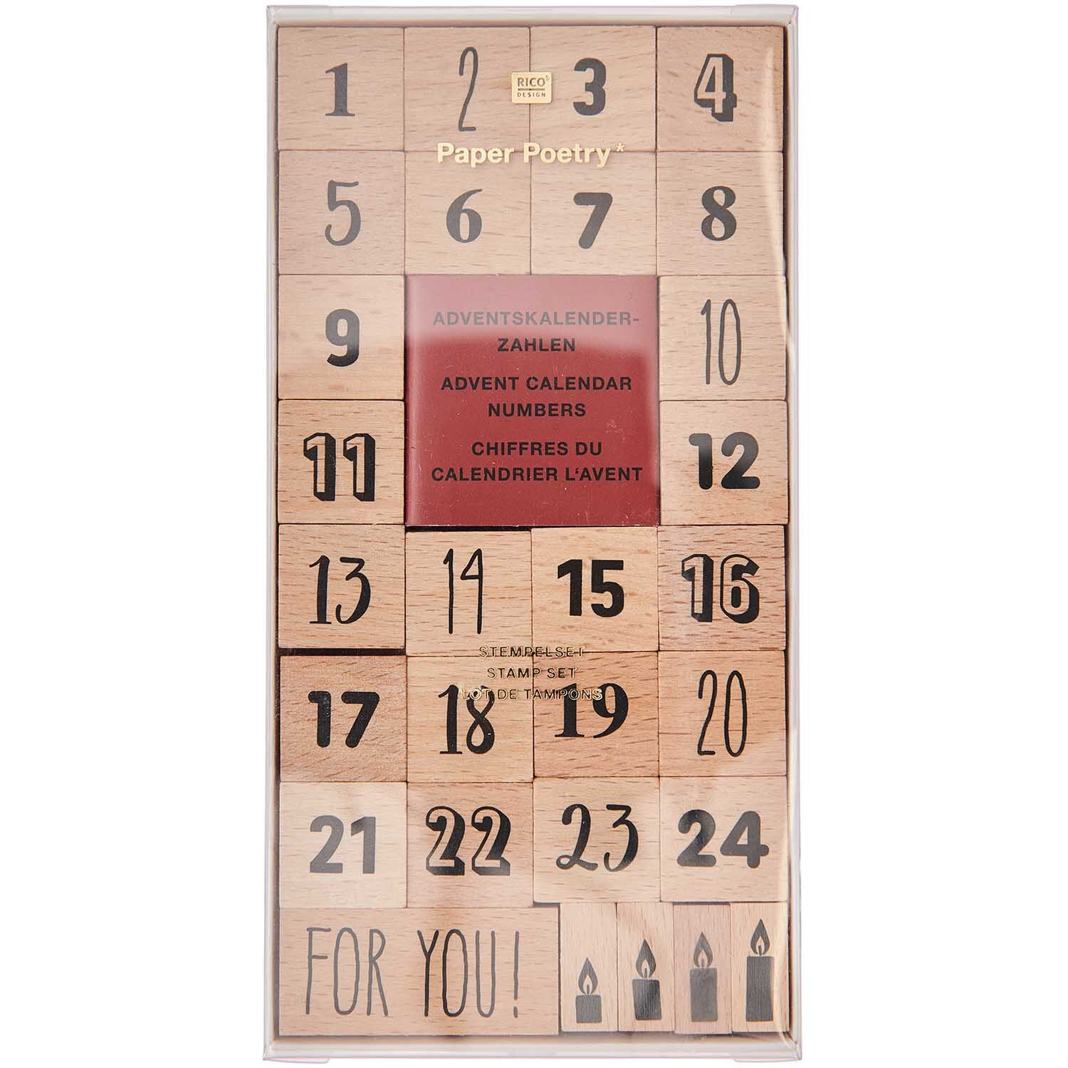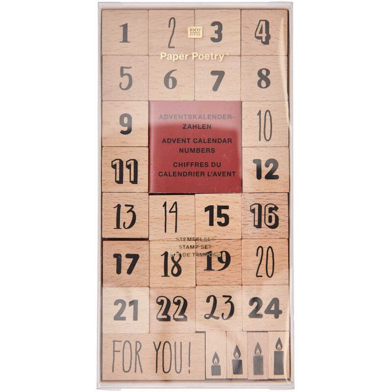 Dieses vielseitige Set ermöglicht es dir, die Zahlen 1 bis 24 in verschiedenen Schreibweisen auf Papiertüten oder Anhängern zu stempeln, ergänzt durch den Schriftzug „For you!“ und vier verschiedene Adventskerzen.