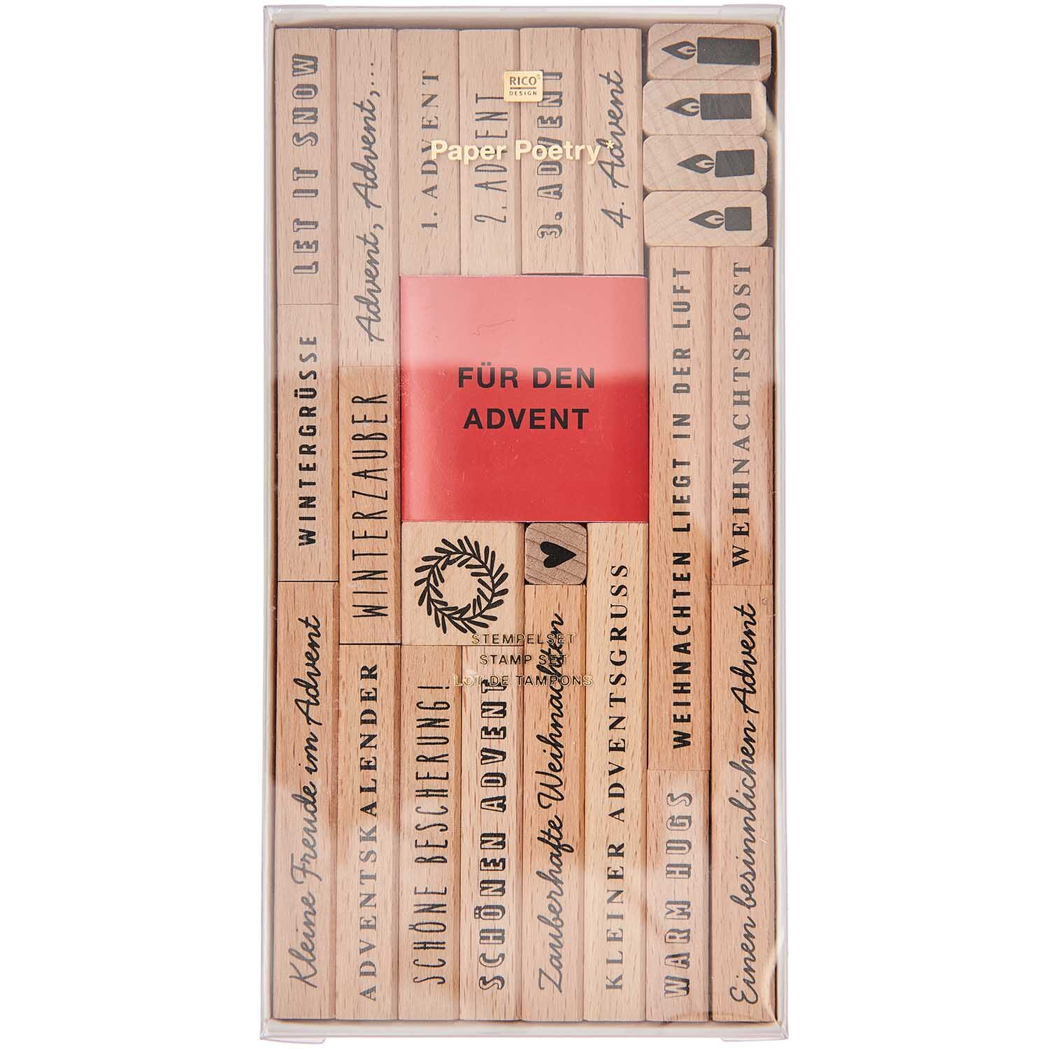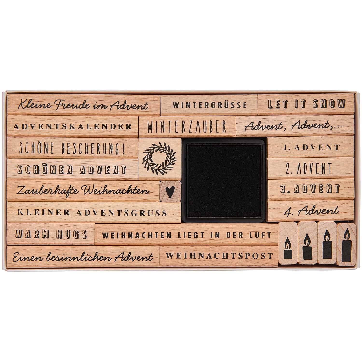 Das Kreativ-Set umfasst 18 festliche Schriftzüge sowie ein schwarzes Stempelkissen und enthält zusätzlich weihnachtliche Motive wie einen Kranz, Adventskerzen und ein kleines Herz. Damit kannst du deinen Weihnachtsbotschaften und -geschenke auf besondere Weise personalisieren.