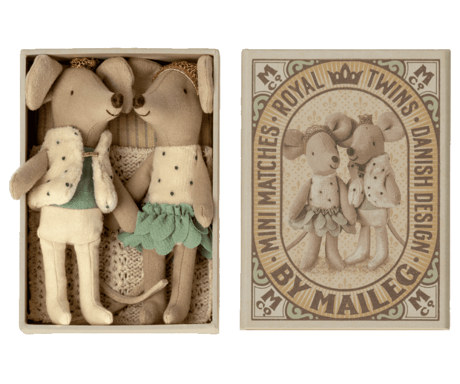 Hach, sind sie nicht bezaubernd! Die kleinen Zwillingsmäuse von Maileg in der königlichen Version. Adrett gekleidet und mit Krönchen geschmückt freuen auch sie sich auf viele Abenteuer mit dir!