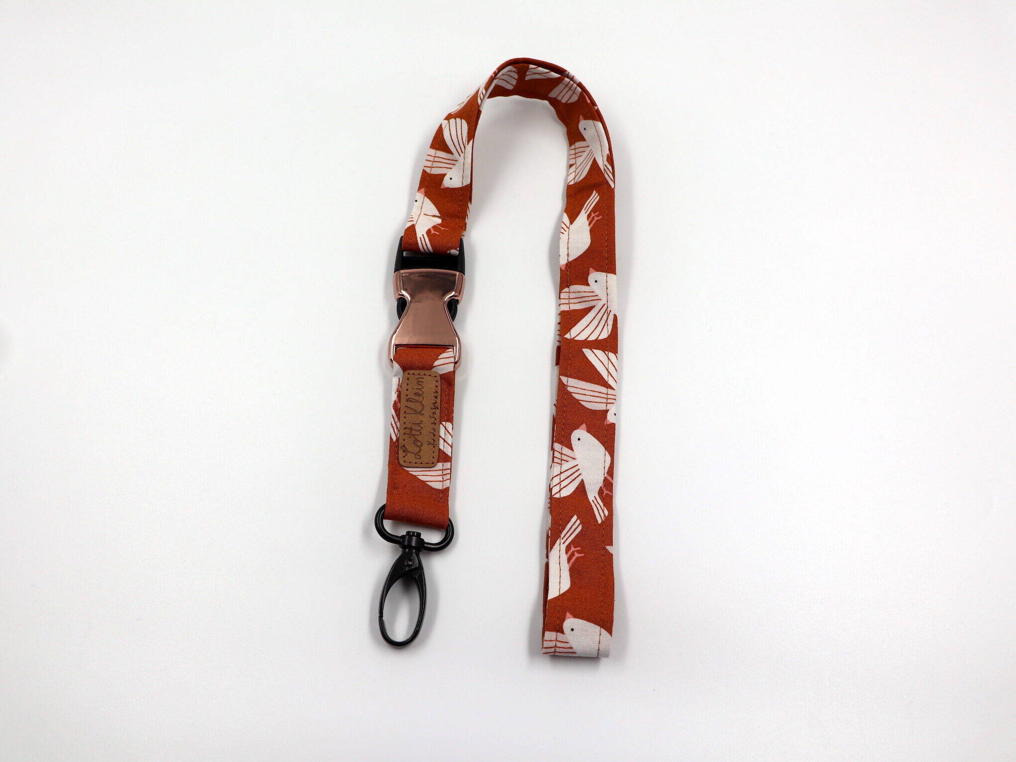 Karabiner oder Edelstahl Schlüsselring, ganz nach deinen Geschmack! Du möchtest das Band gern kürzer? Steckschließe benötigst du nicht – auch das geht!