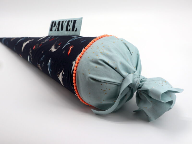 Die Schultüte wird aus hochwertigen Designerstoffen genäht und auf Wunsch mit dem Namen des Schulkindes individualisiert. Die Tüte ist 70cm hoch und wird mit einem entsprechenden Papprohling geliefert. Um eine bleibende Erinnerung an den Einschulungstag zu haben, kann nach der Einschulung der Papprohling aus der Schultüte entfernt werden und und mit dem Inlet als Kuschelkissen Einzug in das Kinderzimmer halten.