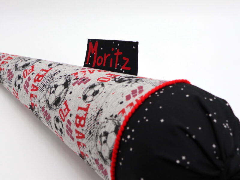 Wir nähen die passende Zeugnismappe in dem Stoff des Tütenkörpers. Hier gibt es nähere Details.