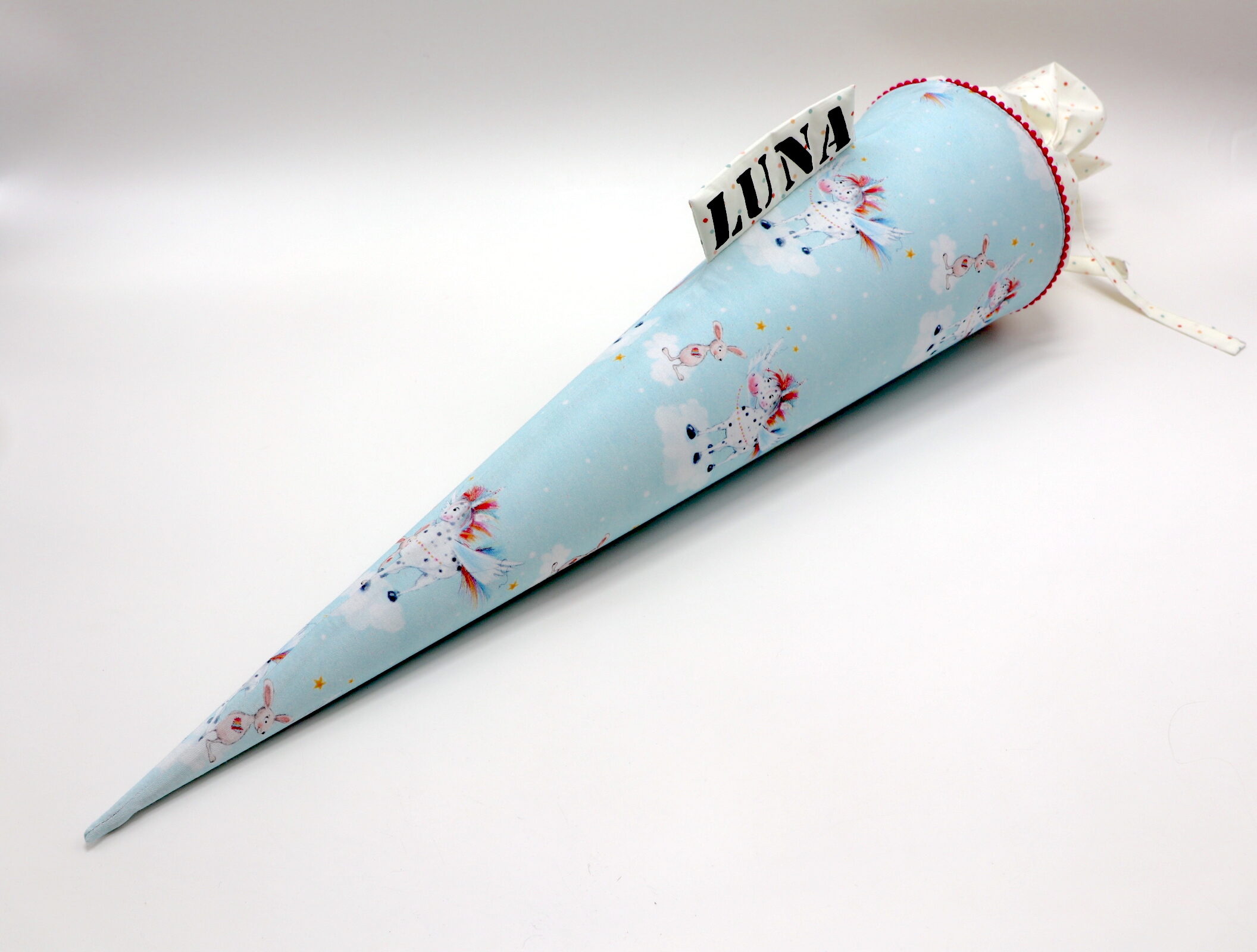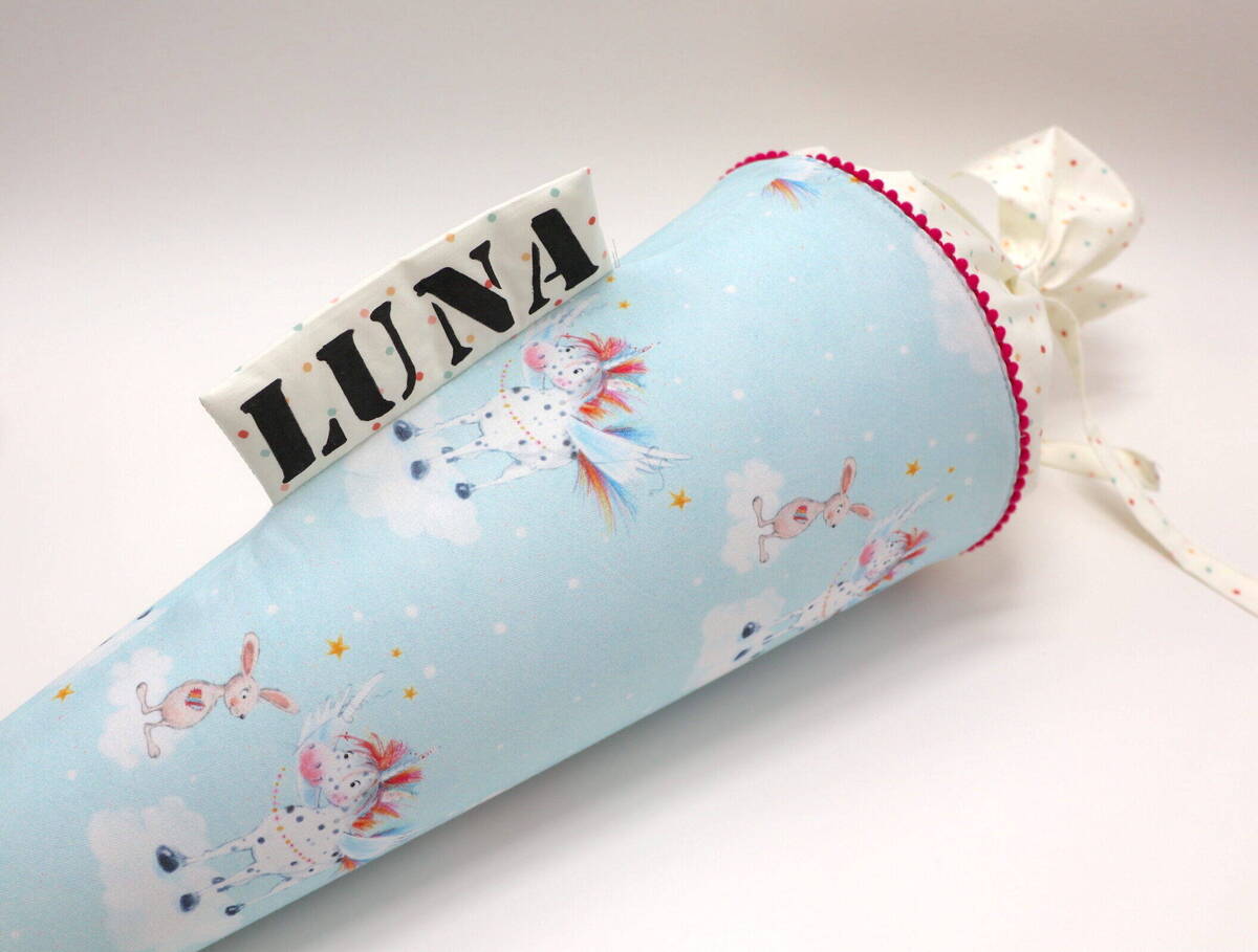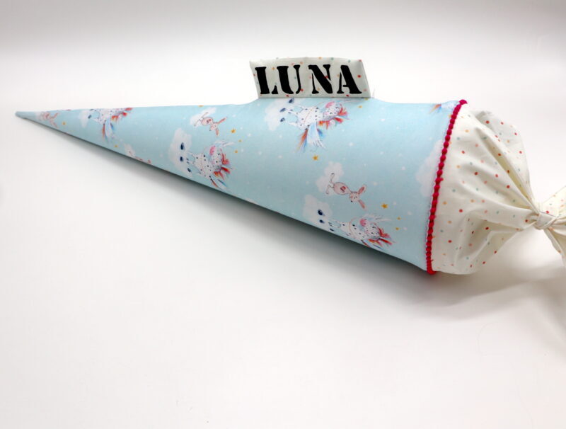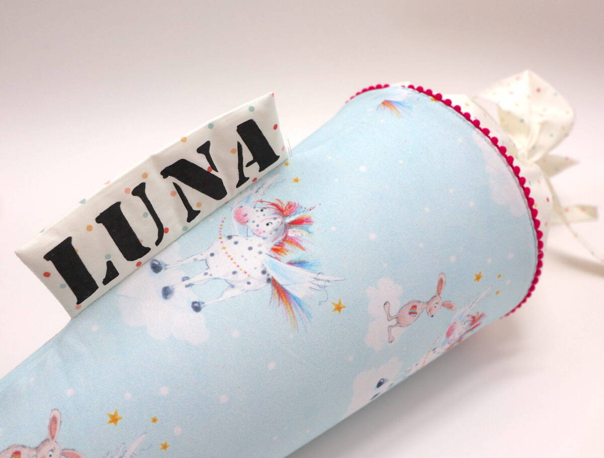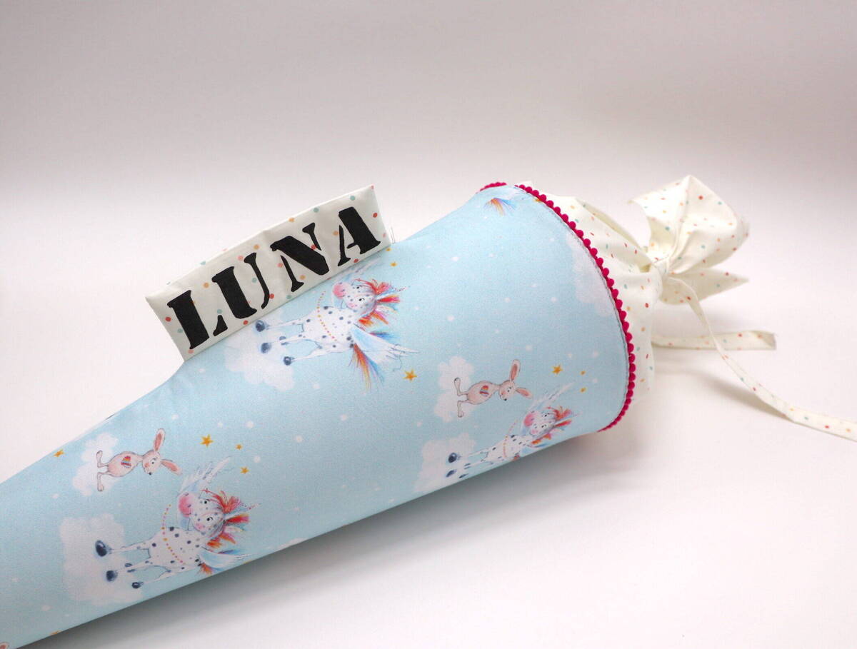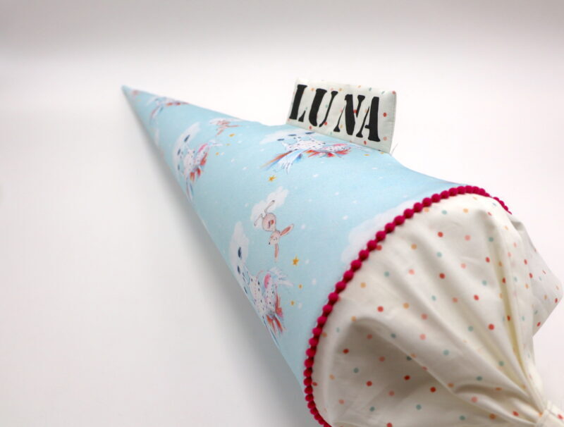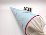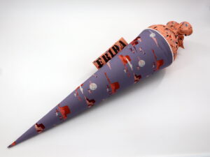 Die Schultüte wird aus hochwertigen Designerstoffen genäht und auf Wunsch mit dem Namen des Schulkindes individualisiert. Die Tüte ist 70cm hoch und wird mit einem entsprechenden Papprohling geliefert. Um eine bleibende Erinnerung an den Einschulungstag zu haben, kann nach der Einschulung der Papprohling aus der Schultüte entfernt werden und und mit dem Inlet als Kuschelkissen Einzug in das Kinderzimmer halten.