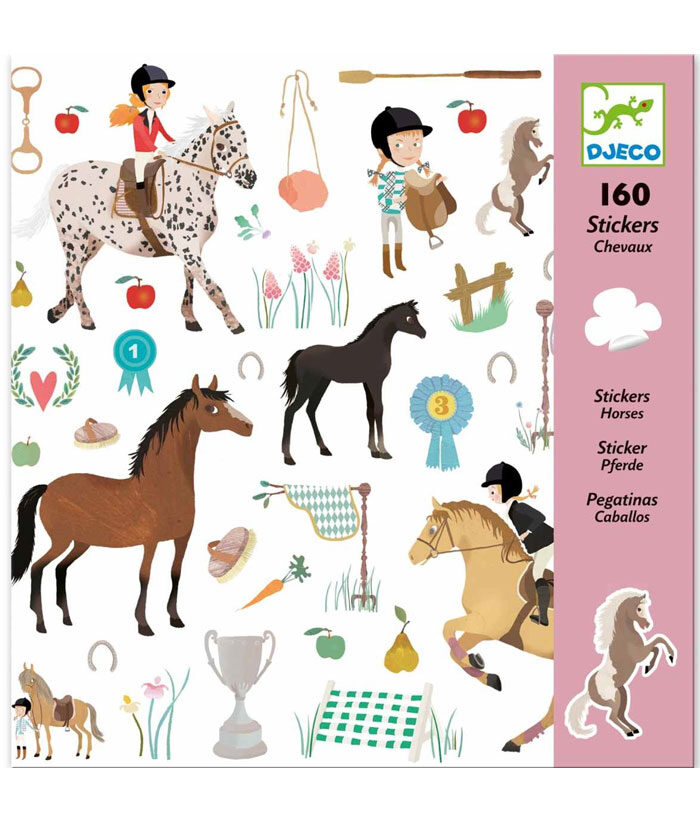 Dieses schönes Set von Djeco ist perfekt zum Basteln und Verschönern von Erinnerungsbüchern, Grußkarten und Bildern. Der Fantasie sind keine Grenzen gesetzt. Die zwei Tafeln enthalten insgesamt 160 Aufkleber zum Thema Pferde und Reiten. Motive wie Reittier, Sattel, Reiter, Trophäen dürfen dabei natürlich nicht fehlen. Das regt die Fantasie der jungen Pferdenarren an!