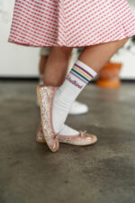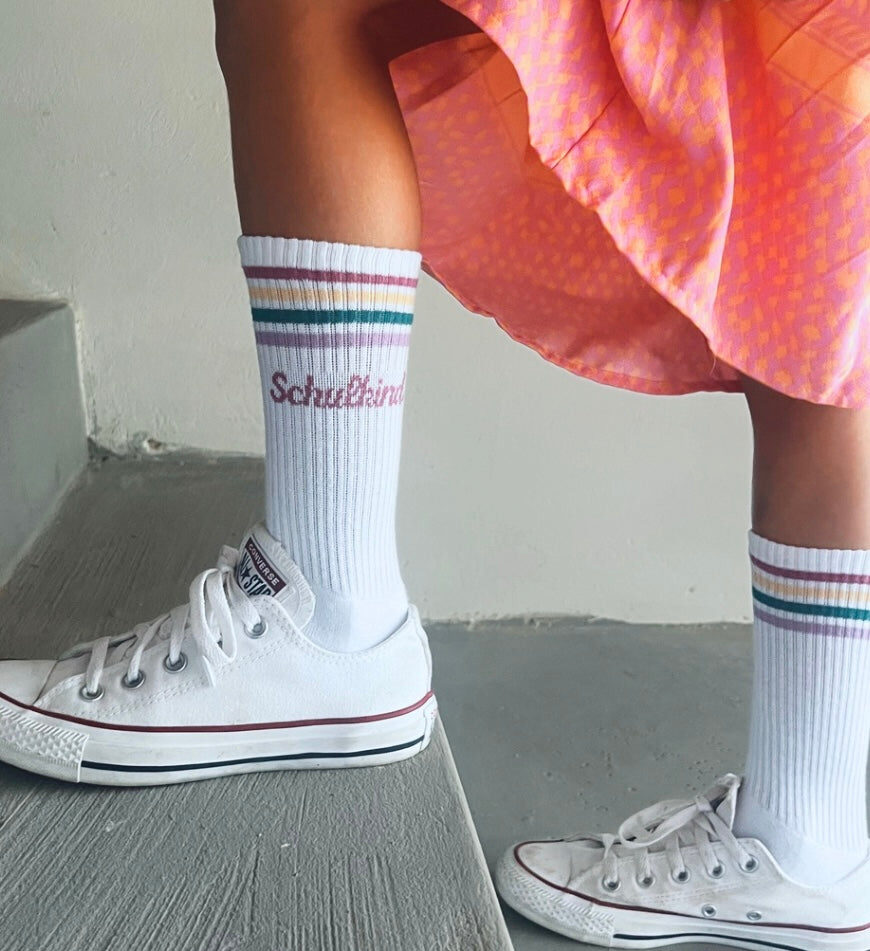 Endlich Schulkind! Unsere Schulkind Tennissocken im Retro Look sind perfekt für den ersten Schultag. Die Streifen sind in Pastellfarben gestrickt und der Schriftzug in der Farbe pflaume.