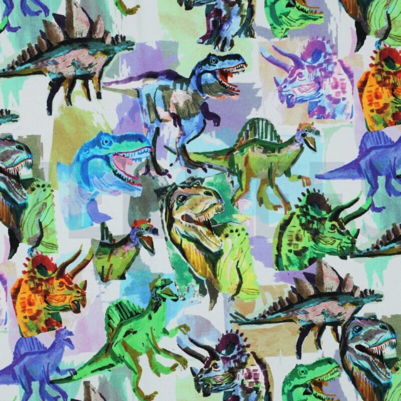Dieser Sweat-Stoff in Weiß mit witzigem Dinosaurier-Motiv ist perfekt für Kinderkleidung, die Spaß macht. Die kuschelige Rückseite und der weiche Griff machen ihn ideal für Hoodies, Jogginghosen, Jacken und warme Kinderoutfits. Ein echter Eyecatcher für kleine Dino-Fans!