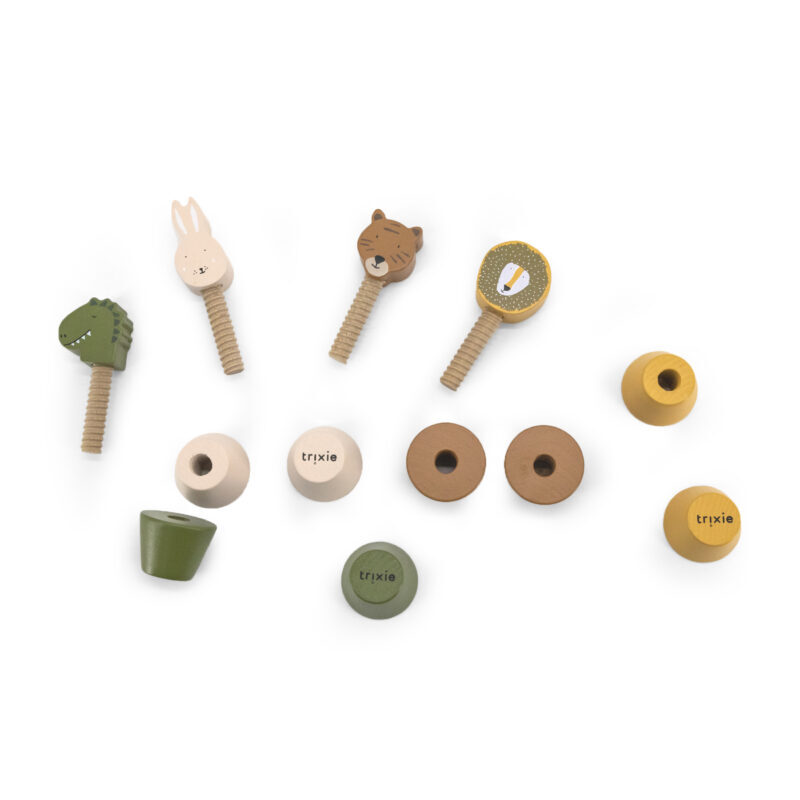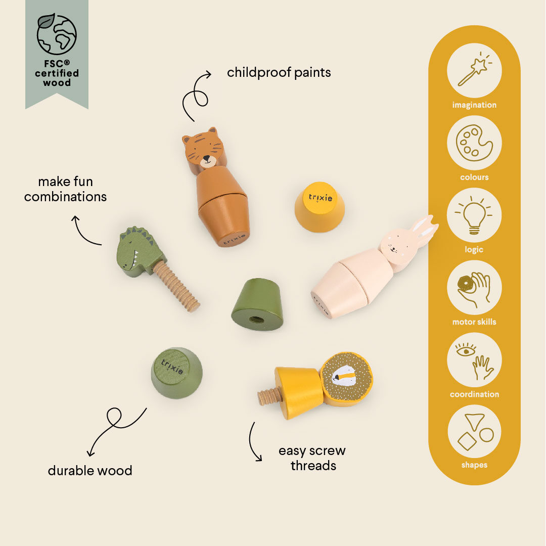 Das Set enthält 4 verschiedene Tiere. Die Holztiere zum Schrauben sind aus 100 % FSC®-zertifiziertem Holz gefertigt. Alle Farben auf diesem Produkt sind auf Wasserbasis, sicher für Kinder und ungiftig.