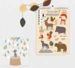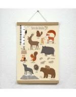 Das herbstlich illustrierte Poster von Vierundfünfzig Illustration zeigt 12 Bewohner des europäischen Waldes – Specht, Biber, Hirsch, Fuchs, Hase, Maus, Wildschwein, Eichhörnchen, Uhu, Wolf, Igel, Bär.