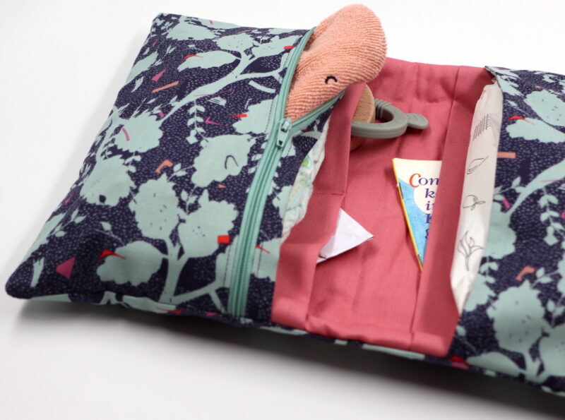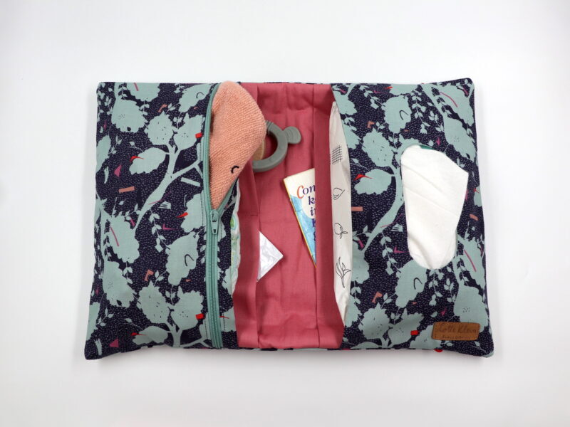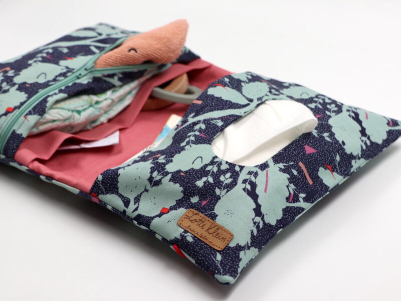 Unsere Windeltasche mit sieben Fächern für Alles was man im Alltag mit dem Baby braucht. Sie ist 26x28cm (aufgeklappt) groß.