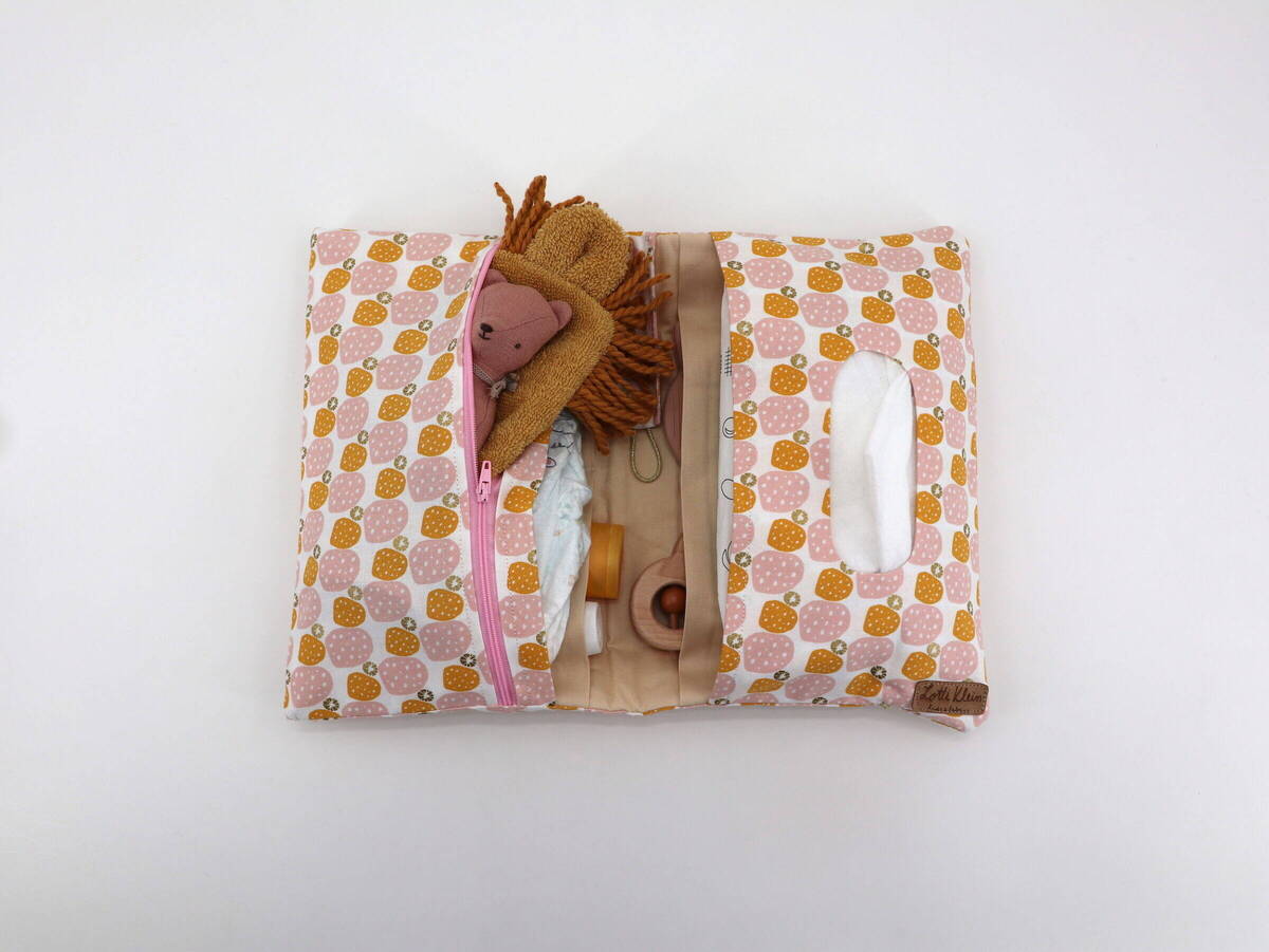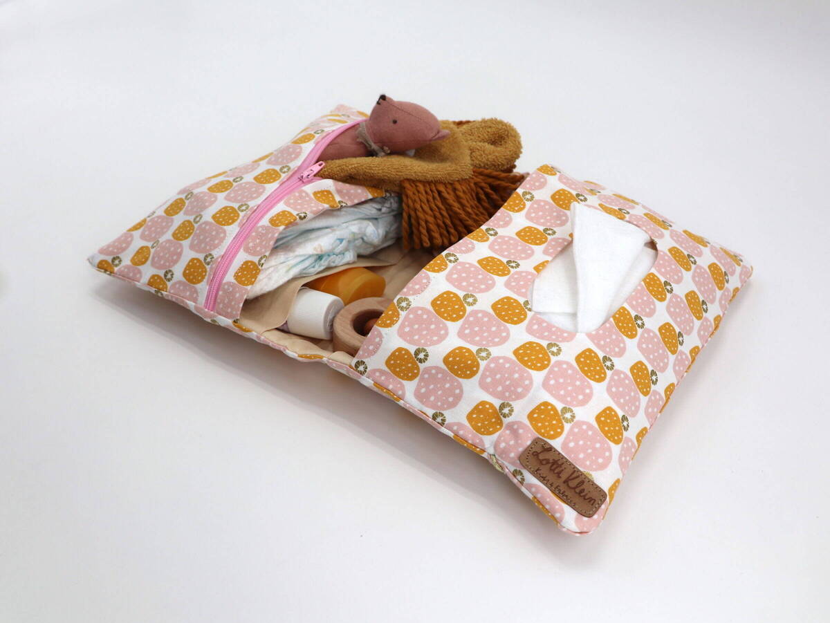 Unsere Windeltasche mit sieben Fächern für Alles was man im Alltag mit dem Baby braucht. Sie ist 26x28cm (aufgeklappt) groß.
