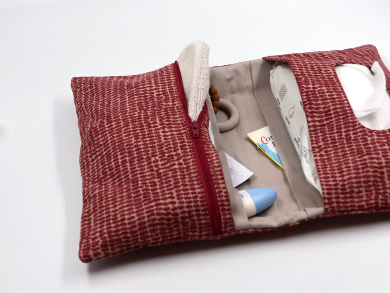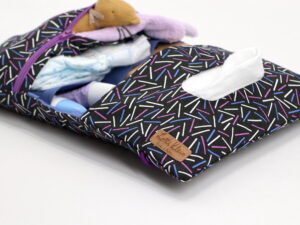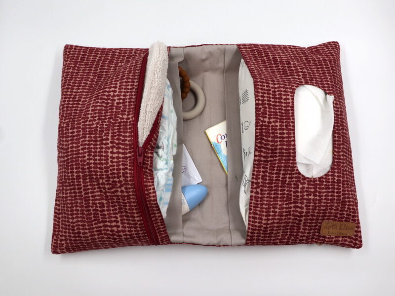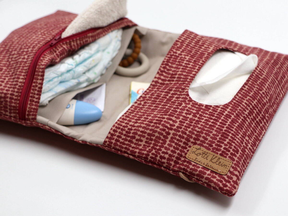 Unsere Windeltasche mit sieben Fächern für Alles was man im Alltag mit dem Baby braucht. Sie ist 26x28cm (aufgeklappt) groß.