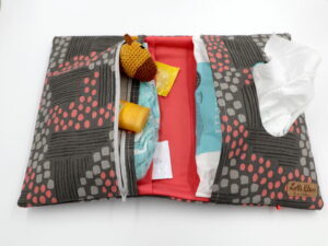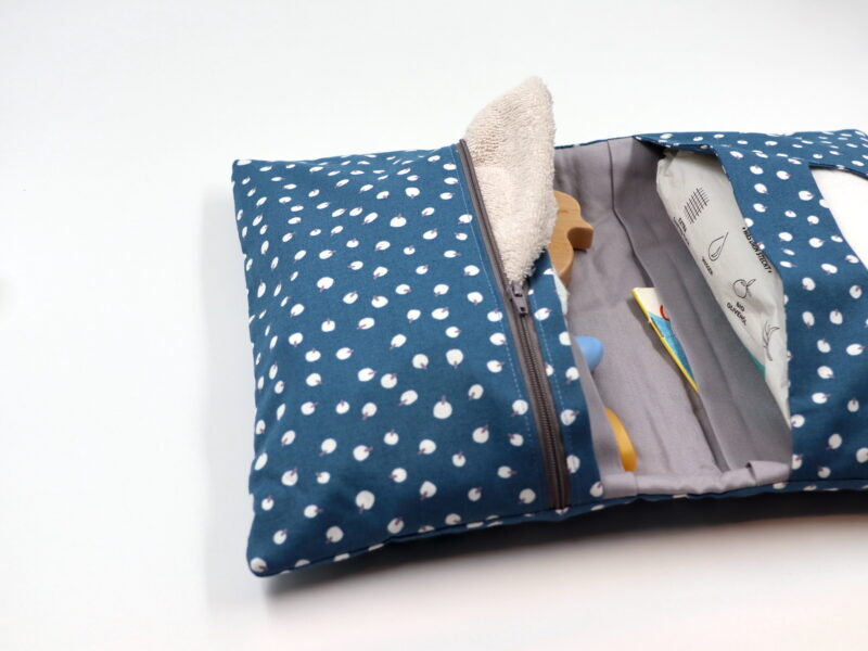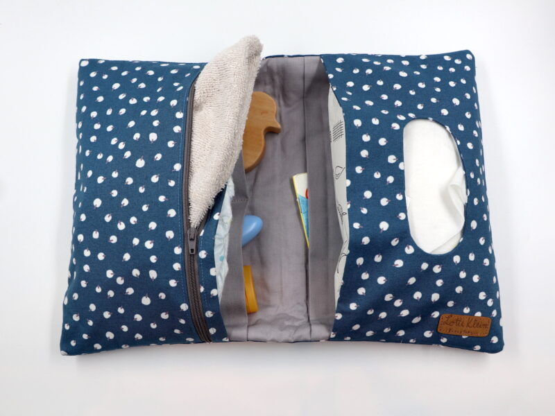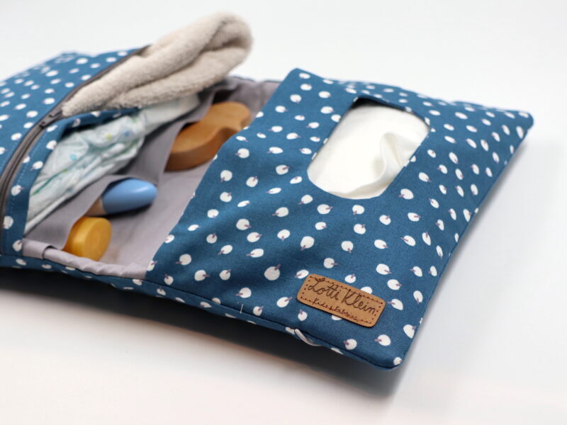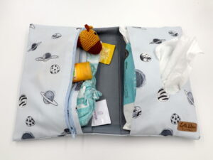 Unsere Windeltasche mit sieben Fächern für Alles was man im Alltag mit dem Baby braucht. Sie ist 26x28cm (aufgeklappt) groß.