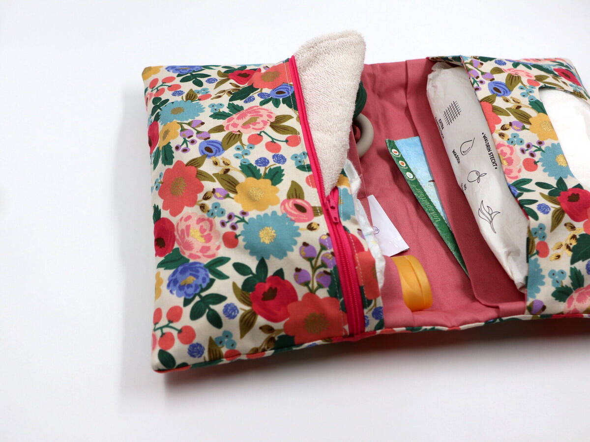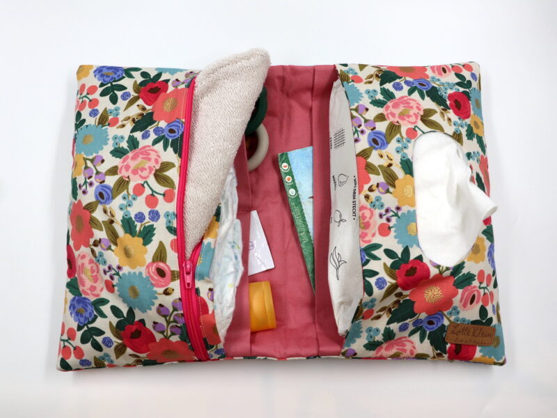 Unsere Windeltasche mit sieben Fächern für Alles was man im Alltag mit dem Baby braucht. Sie ist 26x28cm (aufgeklappt) groß.