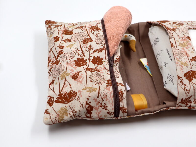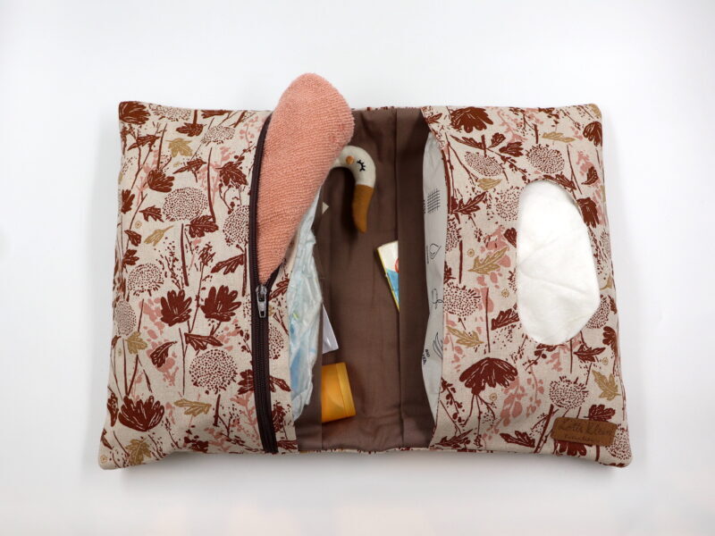 Unsere Windeltasche mit sieben Fächern für Alles was man im Alltag mit dem Baby braucht. Sie ist 26x28cm (aufgeklappt) groß.