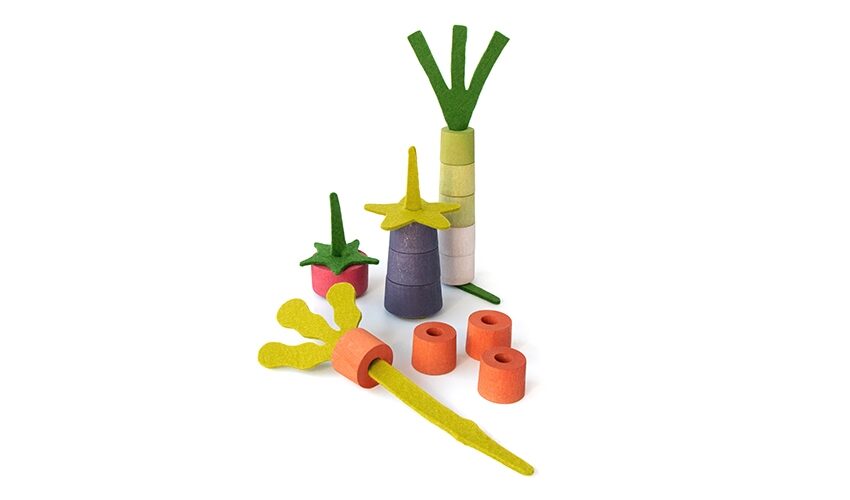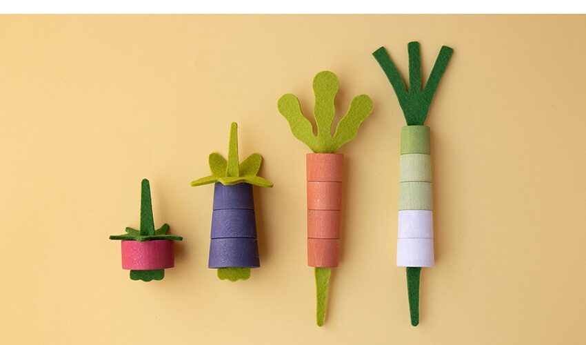 Ein Holzspielzeug für die Kleinsten. Vom Verknüpfungsspiel zum symbolischen Spiel mit diesen vier herrlichen Gemüsesorten. Hergestellt aus Holz aus nachhaltiger Forstwirtschaft.